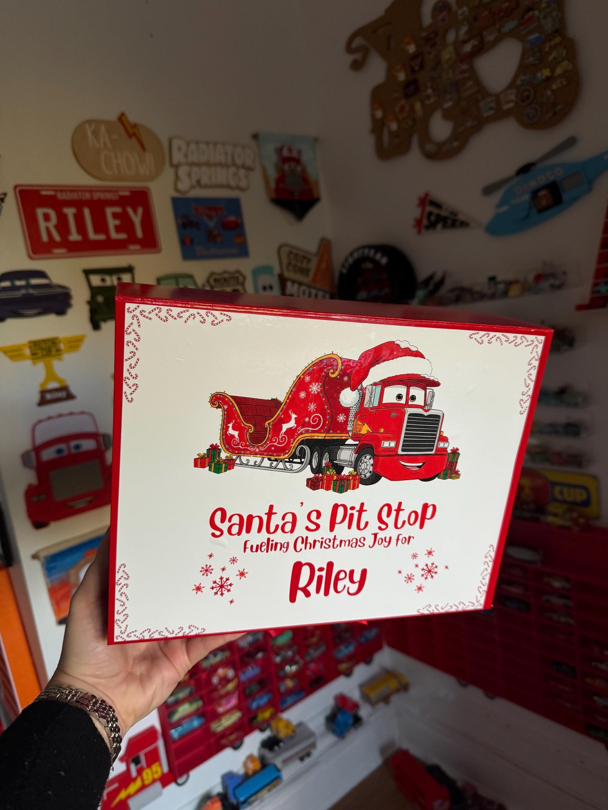 Make Christmas Eve extra magical with this personalized Cars-themed Christmas Eve Box! Featuring Lightning McQueen surrounded by festive decorations, gifts, and a Christmas tree, this keepsake box is perfect for holding little surprises, cozy pajamas, sweet treats, or holiday activities to enjoy the night before Christmas.